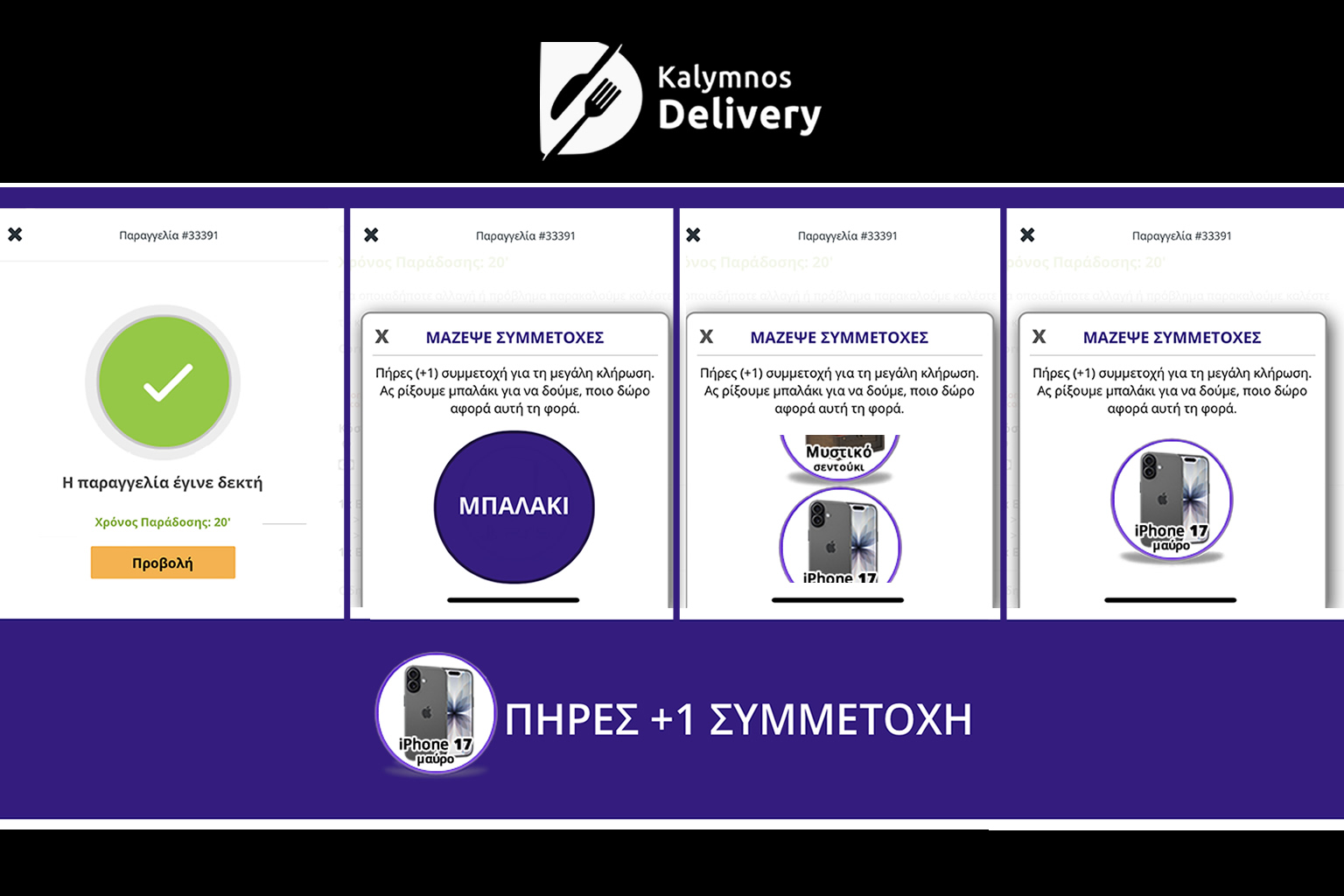 Με κάθε παραγγελία μέσω Kalymnos Delivery, κερδίζεις +1 συμμετοχή. Μετά από κάθε ολοκλήρωση παραγγελίας, το σύστημα θα σε βάλει να παίξεις το γνωστό Καλύμνικο παιχνίδι «μπαλάκι», το οποίο και θα καθορίσει σε ποια κλήρωση πήρες +1 συμμετοχή.