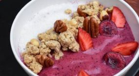 Smoothie bowl με φρούτα του δάσους, γάλα αμυγδάλου, σπόρους chia, φρέσκα φρούτα, granola, καρύδα τριμμένη, κομματάκια καρύδας, πραλίνα λευκή, ξηρούς καρπούς