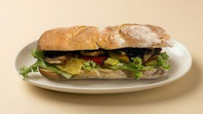 Μπαγκέτα με κοτομπουκιές vegan, vegan τυρί, spicy mayo & καραμελωμένα κρεμμύδια