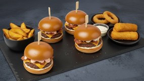 2 Mini burger επιλογής, 1 πατάτες τηγανητές, 2 Onion rings & 2 Mac n cheese κροκέτες