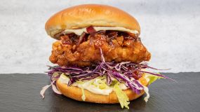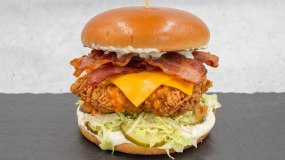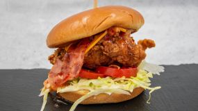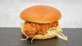 Ψωμάκι brioche με τραγανά φιλετάκια κοτόπουλου, cheddar, μπέικον, iceberg, ντομάτα, mayo & sweet chilli sauce