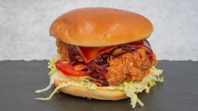 Ψωμάκι brioche με τραγανά φιλετάκια κοτόπουλου, cheddar, μπέικον, iceberg, ντομάτα, μαγιονέζα & BBQ sauce