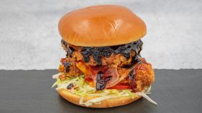 Michelen brioche με 2 κομμάτια τραγανού φιλέτου κοτόπουλου, διπλό cheddar, τραγανά πατατάκια Doritos, διπλό καπνιστό bacon, onion rings, τηγανητό αυγό, iceberg, μαγιονέζα & sweet chilli sauce