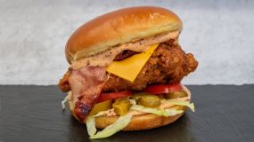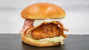Ψωμάκι brioche με 2 στρώσεις από τραγανά φιλετάκια μπέικον, iceberg, τυρί cheddar, ντομάτα, μαγιονέζα & BBQ Kentucky sauce