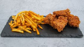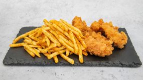 5 λωρίδες τραγανού φιλέτου κοτόπουλου. Συνοδεύεται με πατάτες τηγανητές