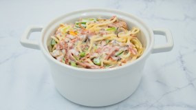 Ζυμαρικά (σπαγκέτι) με κρέμα γάλακτος, μπέικον, πιπεριά, μανιτάρια, γκούντα