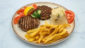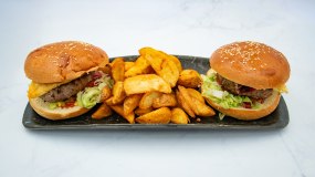 Περιέχει 2 burgers. Με μπιφτέκι, μαρούλι, ντομάτα, κέτσαπ, μουστάρδα, μπέικον, ομελέτα, cream σως. Συνοδεύεται με πατάτες τηγανητές