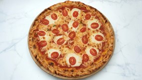 Πίτσα με σάλτσα ντομάτας, τυρί γκούντα, μοτσαρέλα, ντοματίνια