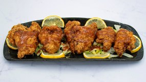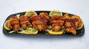 Φτερούγες κοτόπουλου με σως BBQ. Συνοδεύεται με πατάτες τηγανητές