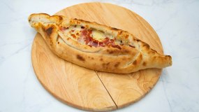 Καλτσόνε με σάλτσα ντομάτας, τυρί γκούντα, μοτσαρέλα, ζαμπόν, μπέικον, πεπερόνι, μανιτάρια, ντομάτα, φέτα