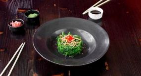 Ψιλοκομμένα φιλετάκια σολομού με αβοκάντο, wakame φύκια, ντομάτα, πράσινο & κόκκινο αυγοτάραχο & wafu dressing