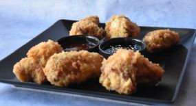 Παναρισμένα κομμάτια κοτόπουλο με καρότο, κρεμμύδι, ανανά, πράσινες & κόκκινες πιπεριές. Προτείνεται να συνοδευτούν με ρύζι ατμού.
