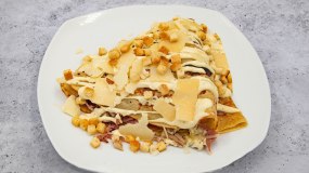 Σαλάτα με κοτόπουλο, μαρούλι, κρεμμύδι, ντομάτα, πιπεριά, αγγούρι, μαγιονέζα, ρόδι και doritos