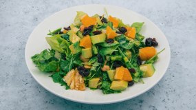 Σαλάτα με μαρούλι, ρόκα αγγούρι, πιπεριά, μουστάρδα, μέλι, αβοκάντο, κασίους, κράνμπερι & πορτοκάλι
