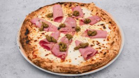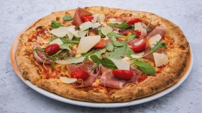 Ζύμη πίτσας με ελαιόλαδο, άνθος αλατιού, δεντρολίβανο, προσούτο Πάρμας.
