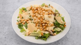 Σαλάτα με μαρούλι, λόλα, παρμεζάνα τριμμένη, παρμεζάνα φλούδες, κοτόπουλο, κρουτόν, μπέικον & σως καίσαρα