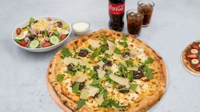 1 γίγας πιτσα, 1 γλυκιά πίτσα μερέντα, 1 σαλάτα σεφ ή σιζαρς, 1 αναψυκτικό 1.5lt