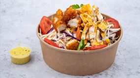 Σαλάτα με λάχανο καρότο, παναρισμένο κοτόπουλο φιλέτο, καλαμπόκι, ντομάτα, αυγό, σως Ορνιθοτροφήο