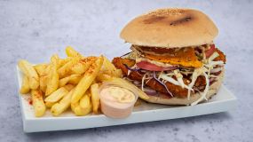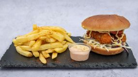 Ψωμάκι brioche με τραγανά φιλετάκια κοτόπουλο, καραμελωμένα κρεμμύδια, ντομάτα, λάχανο-καρότο & burger sauce