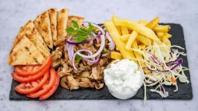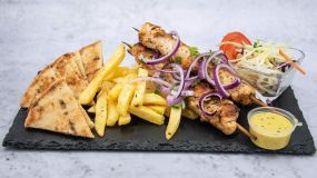 Μερίδα σουβλάκι από στήθος κοτόπουλο, 3τμχ. Συνοδεύεται από πατάτες τηγανητές, σαλάτα, πίτα παραδοσιακή, σως επιλογής σας.