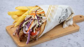 Μερίδα γύρος κοτόπουλο. Συνοδεύεται από πατάτες τηγανητές, σαλάτα, πίτα παραδοσιακή, σως επιλογής σας.