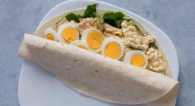 Με κοτόπουλο, μαγιονέζα, γιαούρτι, καρότο, αυγό, κρεμμύδι, μαρούλι, μπαχαρικά