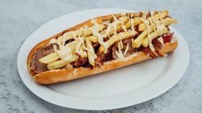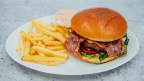 Με μοσχαρίσιο μπιφτέκι, τυρί cheddar, μπέικον, αυγό, μαρούλι, ντομάτα, αγγουρομαγιονέζα, καραμελωμένό κρεμμύδι, μουστάρδα & ketchup. Συνοδεύεται από πατάτες τηγανητές