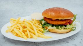 Με κοτόπουλο πανέ, τυρί cheddar, μαρούλι, ντομάτα & μαγιονέζα. Συνοδεύεται από πατάτες τηγανητές