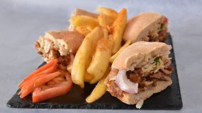 Με κοτόπουλο, μπέικον, λαχανικά, τυρί στο τηγάνι, ψημένα σε ψωμί στο φούρνο. Συνοδεύεται από πατάτες τηγανητές