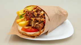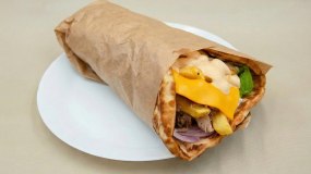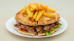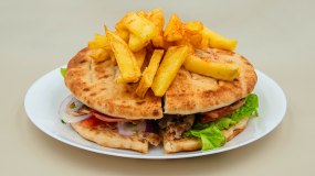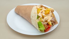 Σκεπαστή / Πίτα club με 2 XL πίτες. Περιέχει γύρος κοτόπουλο, τυρί, μαρούλι, ντομάτα, μαγιονέζα, μπέικον, κρεμμύδι & σαλάτα coleslaw. Συνοδεύεται από φρέσκες τηγανητές πατάτες